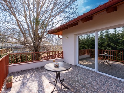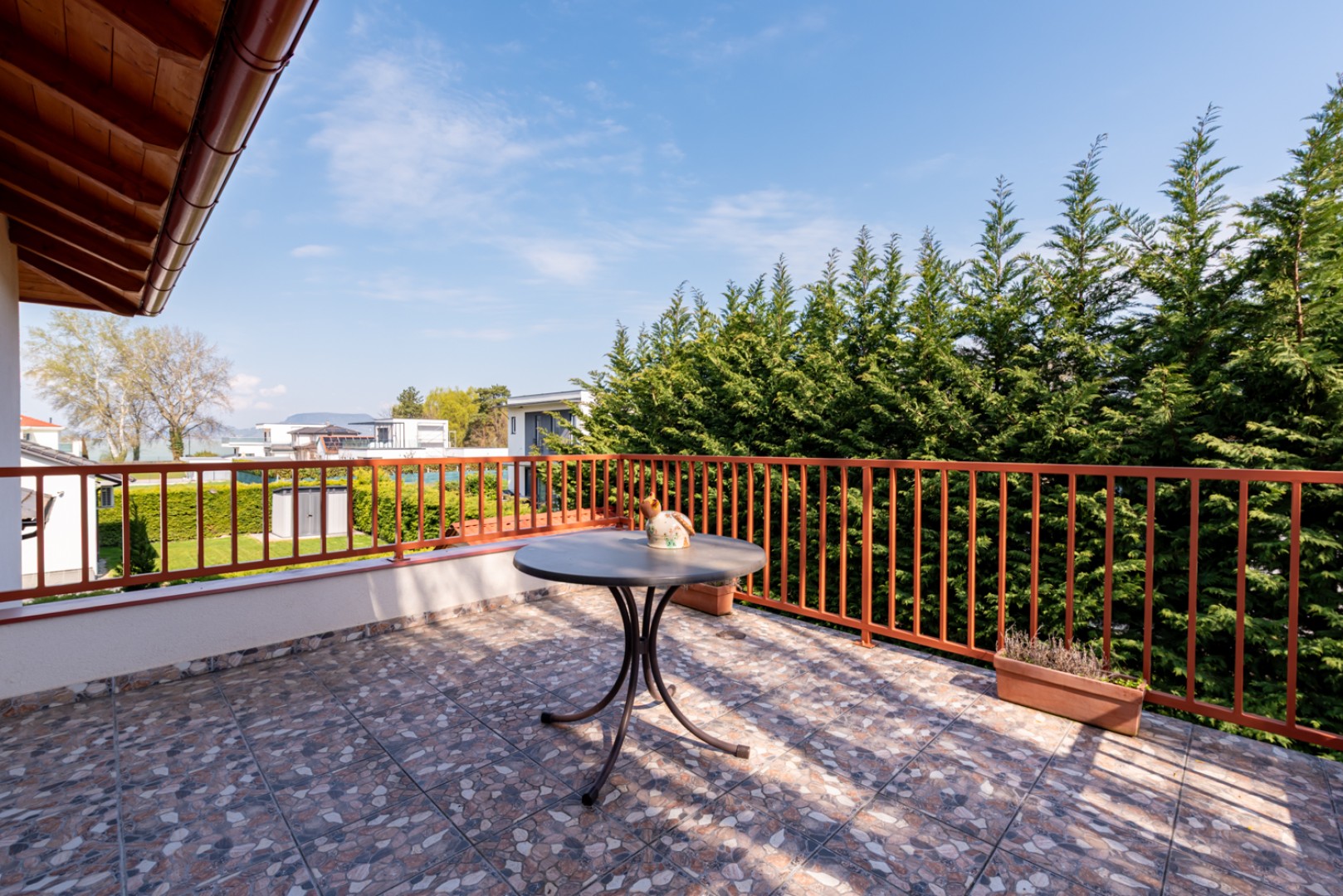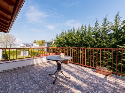 A tágas emeleti teraszról zavartalan kilátás nyílik a Balaton víztükrére és a szemközti badacsonyi tanúhegyekre.